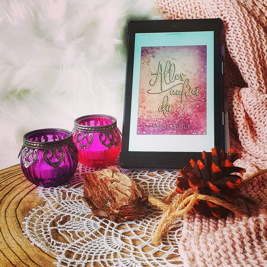 Die Thematik, die in diesem Buch angesprochen wird, ist normalerweise sehr klischeebehaftet und nicht einfach zu verpacken. Nina hat es jedoch geschafft, dieses Thema gut zu verarbeiten und es nicht platt und klischeehaft wirken zu lassen, das ist mir bisher so noch nicht untergekommen. Das Buch wird aus Nickys Sicht in Form eines Countdown bis zu Tag X erzählt, was eine permanente Spannung aufrechterhält. Der Cliffhanger am Ende ist jedoch richtig fies, also stellt sicher, dass Ihr den zweiten Teil ‚Alles außer uns!‘ schon zur Hand habt.